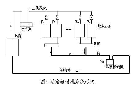 由电动机驱动曲轴,通过连杆带动活塞作往复运动,抽吸蒸汽凝结水和随同进入的新蒸汽,增压后输送至热源。此种技术的应用,其系统构成不使用疏水阀,见下页图2。