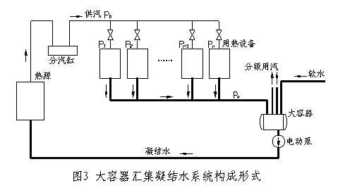 这种系统由于用热设备后不使用疏水阀,新蒸汽可以直通到大容器中,随后又可能直接串到较低一级压力的蒸汽设备。还可以直接加热软水呈饱和态,起类似蓄热器的作用。显然,由于各部分量的关系难以控制、平衡和维持,蓄热器供出蒸汽品质也难以控制,以及运行管理较为复杂等诸多方面的不足而未能成为一种成熟技术。